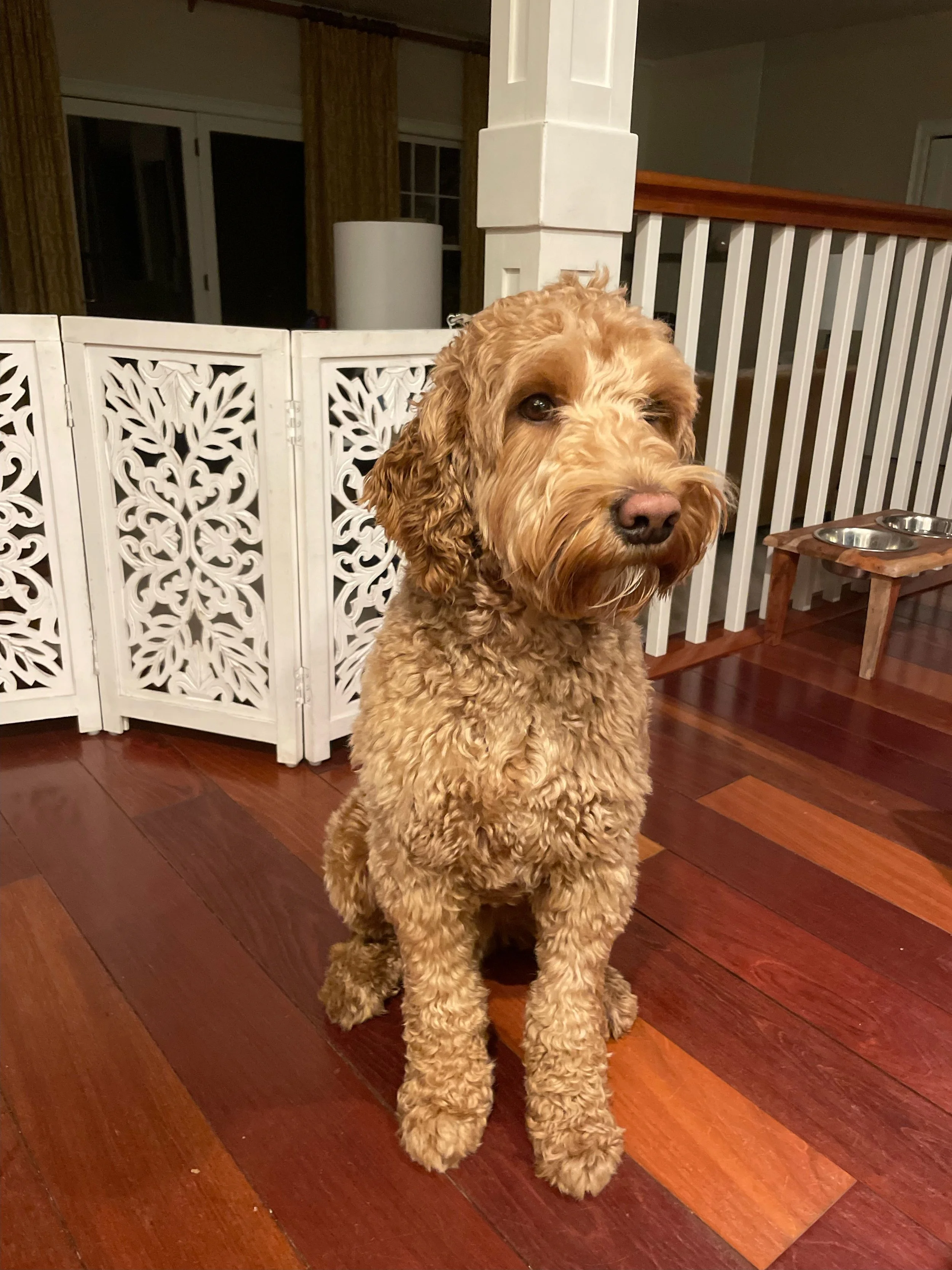Snug Harbor/Farm Rio Novo Buoy, large medium male, 35 lbs. Buoy is a beautiful, well tempered, friendly boy who loves boat rides with his guardian family and playing with his Cobberdog “brother.” He has beautiful fleece coat and has passed all genetic screening.